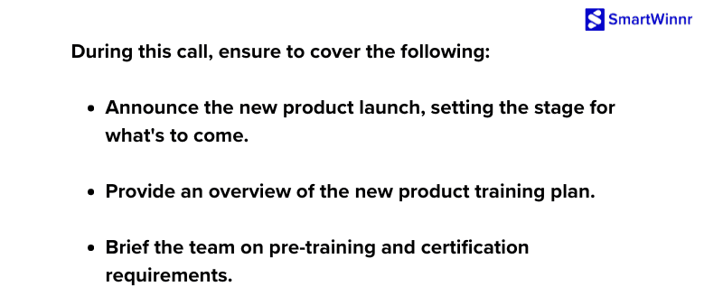 To commence the launch, assemble everyone for a one-hour call to unveil the new product, discuss training, and address related details.
