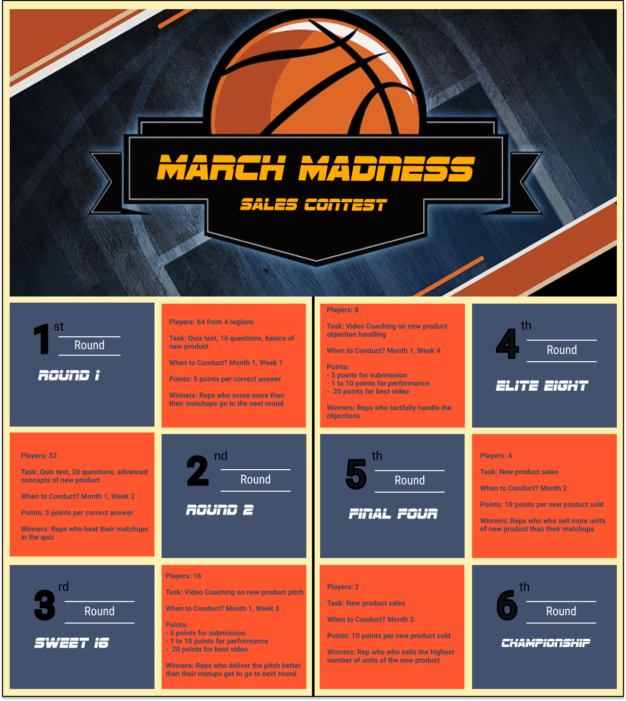 Give march madness themed names to each round. The first 4 rounds focus on improving your reps’ new product knowledge. The last two rounds focus on encouraging your reps to improve new product sales. Here’s how it goes: