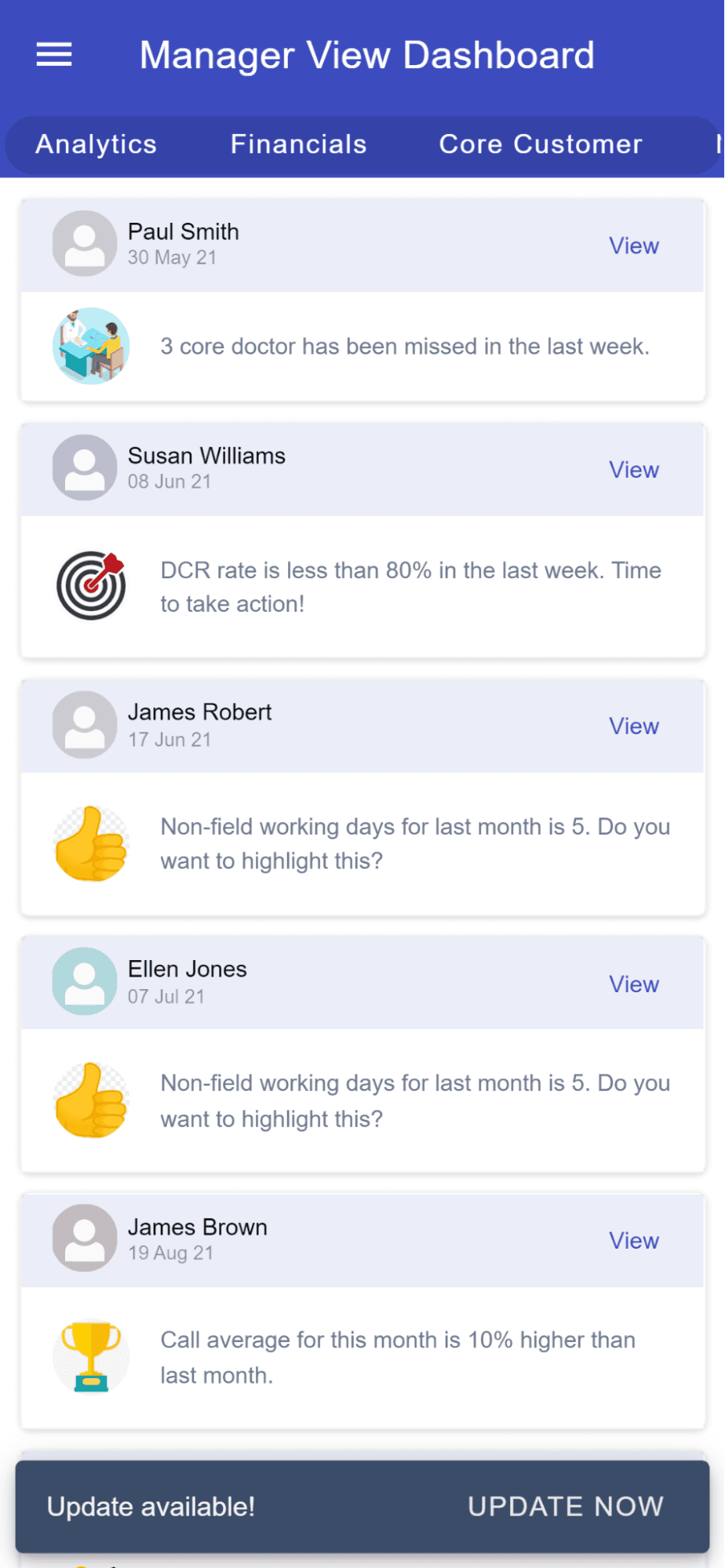 Below are the screenshots which show how a manager views the nudges that have been sent to his team members and how a sales rep views the nudges that he received from the SmartWinnr app