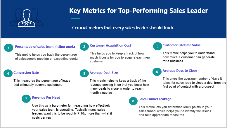 Now arises another important question. What are those crucial metrics to focus on? Well, the “right” metrics actually depend on your sales organization, industry, and company. However, these 7 metrics tend to be important for the sales leaders across the board.