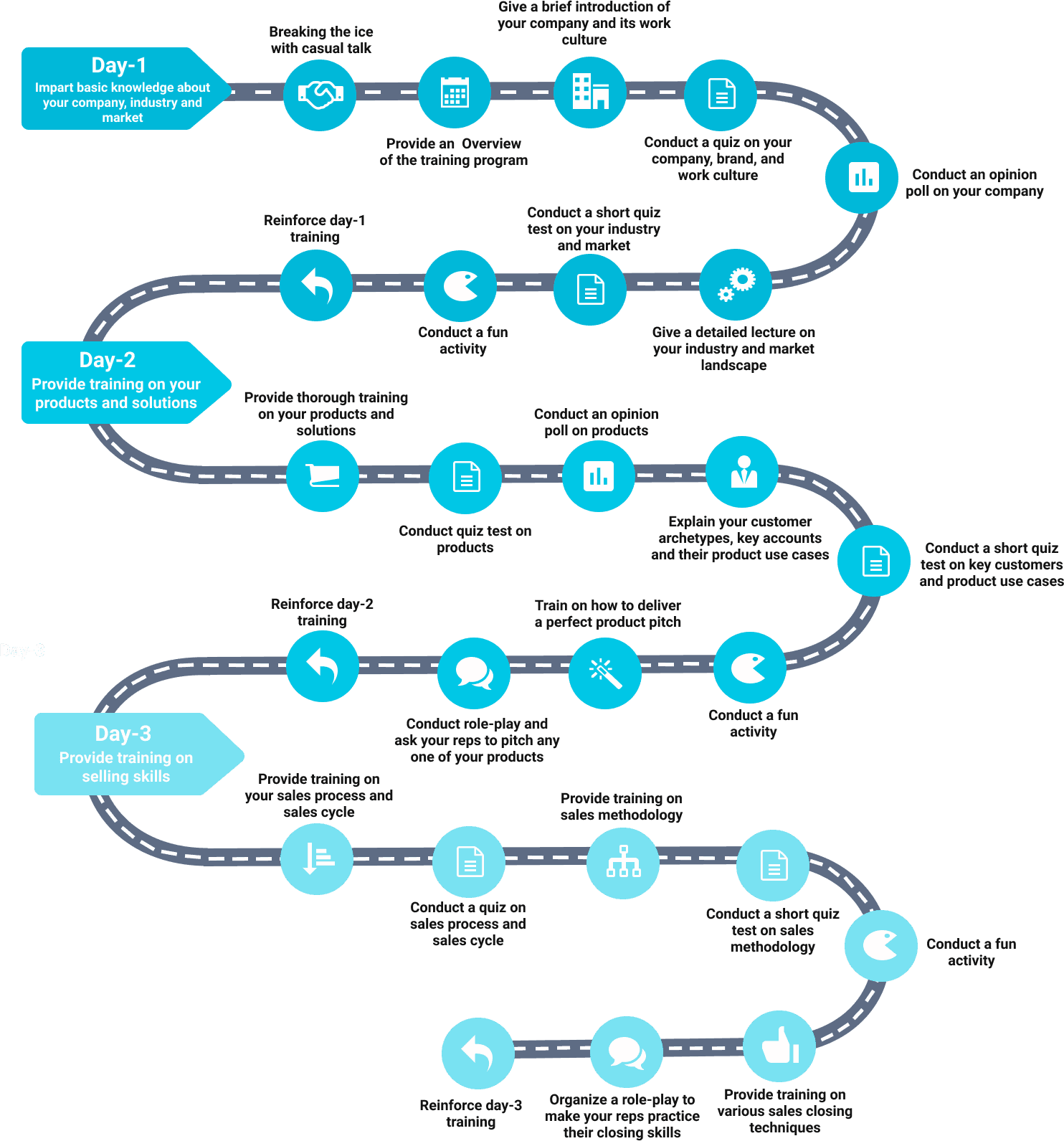 Reinforcement of day-3 training: Reinforce day-3 training by sending out microlearning feeds and quiz tests to help the reps to recall what they have learned that day.