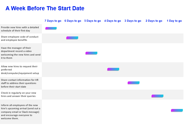 Provide new hires with a detailed schedule of their first day (including directions to the office, the names of the people they’ll be meeting, and what they should plan to do for lunch).
