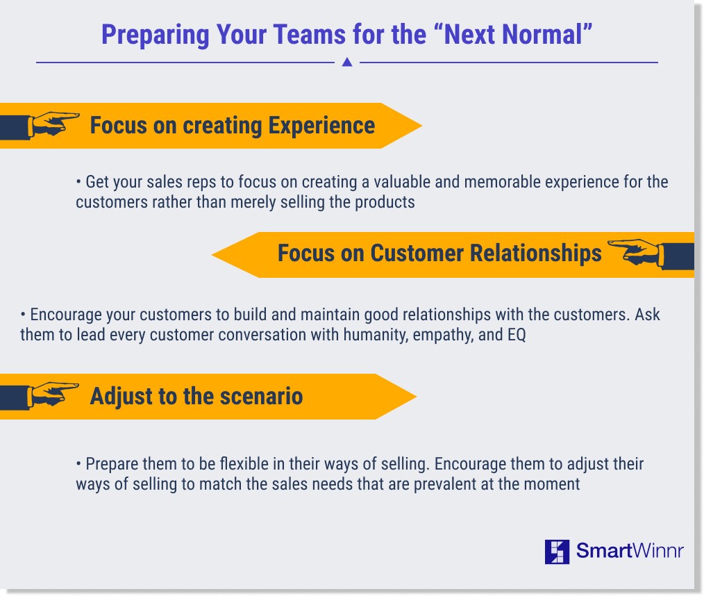 Next up, focus on preparing your sales team to succeed in the next normal. Here are various aspects which will help you to do so: