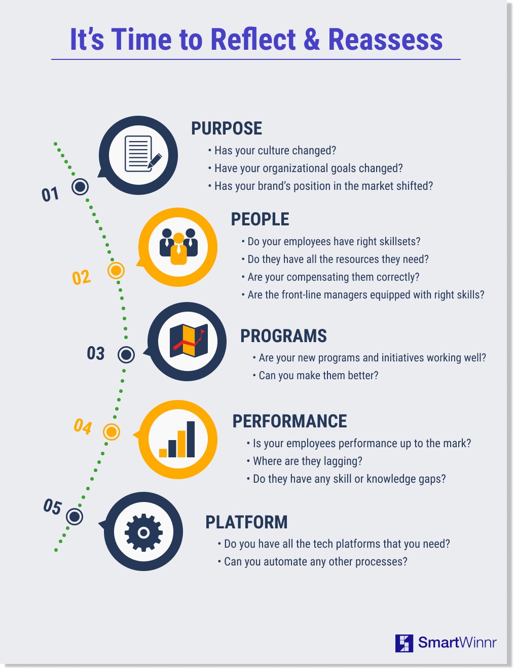 Programs: You must have initiated some new programs in the year 2020. Like remote onboarding programs, remote training programs, or any other initiative. Take a look at those programs and see if they are working fine or if they need to be changed or modified.