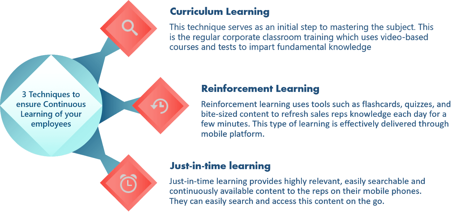 While Curriculum learning is good for introducing the concepts, reinforcement learning helps in retaining those concepts. Reinforcement learning uses tools such as flashcards, quizzes, and bite-sized content to refresh sales reps knowledge each day for a few minutes. This type of learning fits well into the sales rep’s busy schedule as it is presented in small chunks. It can be effectively delivered through mobile devices.