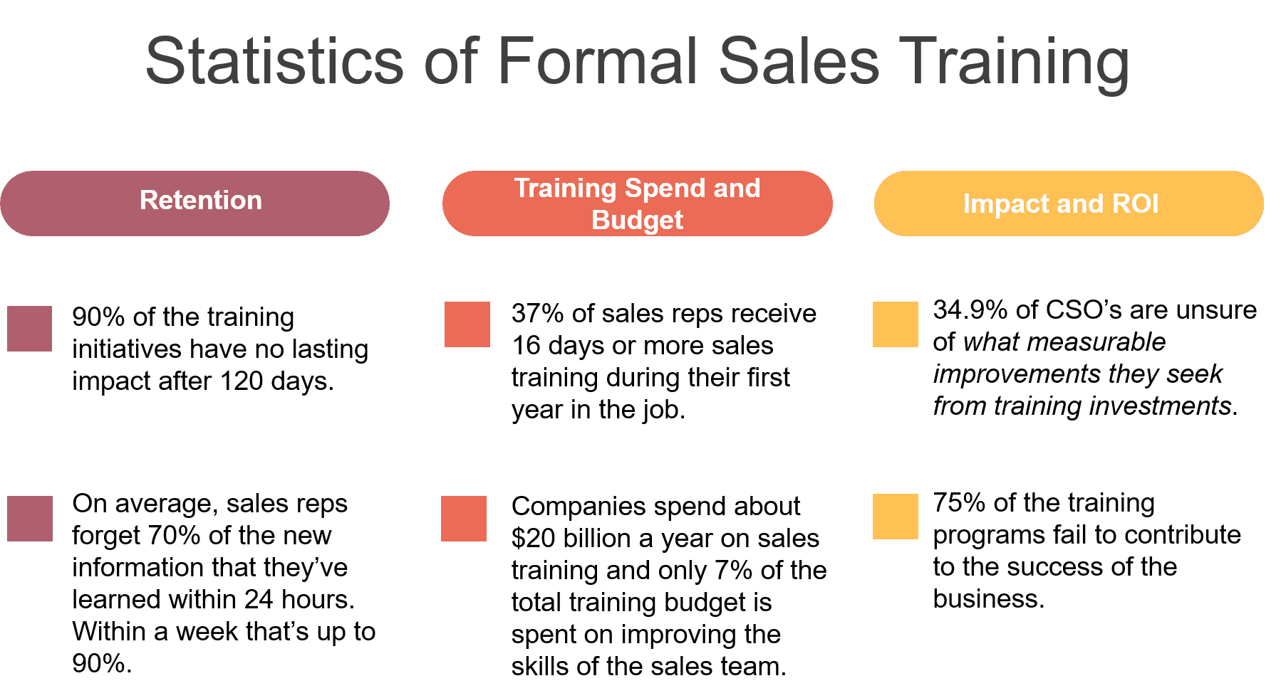 Similarly, it will be ineffective to train your sales team by relying solely on once-in-a-while classroom training - they need continuous training to perform at their peak.