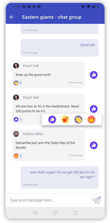 Sales contest software comes with a group chat feature that facilitates communication and collaboration between the members of a group/ sub-group. A group participating in a team-based contest can use this group chat to:
